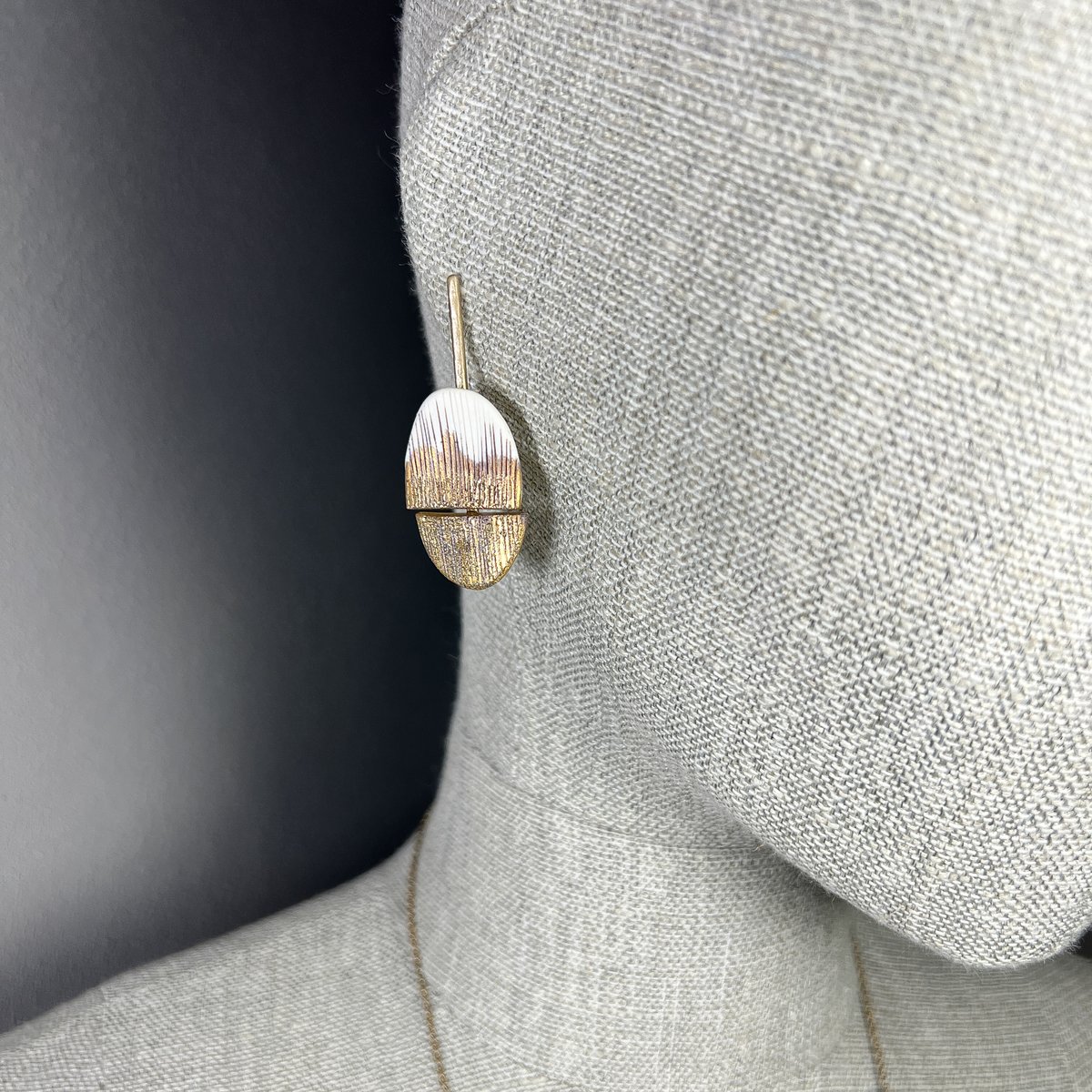 Orecchino con struttura in bronzo che sostiene un elemento in porcellana, bianca o colorata con ossidi ad alta temperatura in impasto e decorata con lustro in oro zecchino: sono leggeri e resistenti, la porcellana viene rinforzata per essere infrangibile.